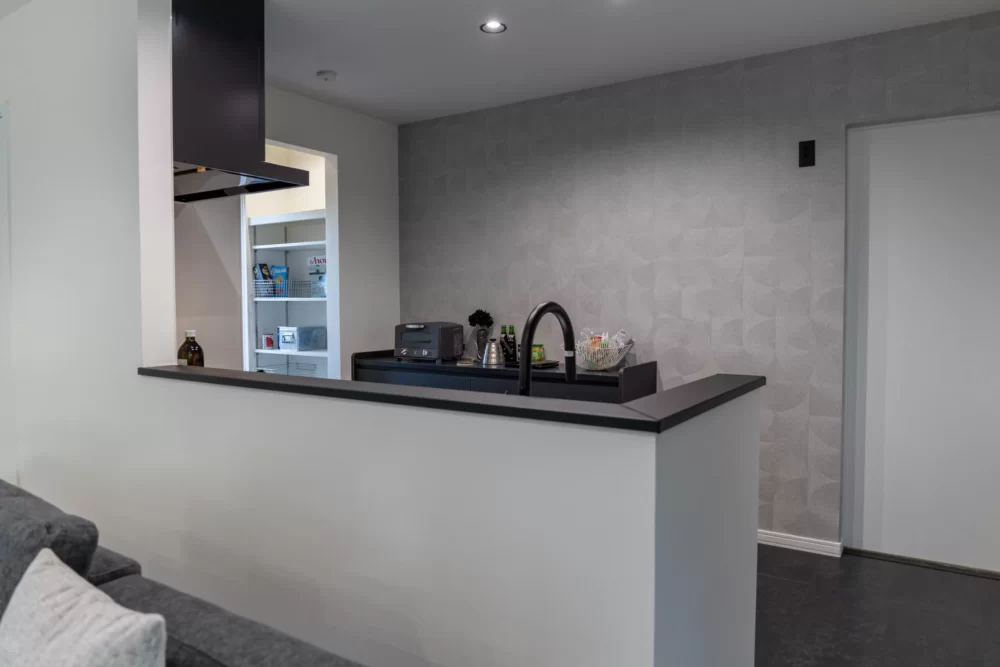 玄関からパントリー、キッチンへとつながる効率的な動線。買い物後の荷物もスムーズに運べ、無駄のない動きで収納まで完結します。