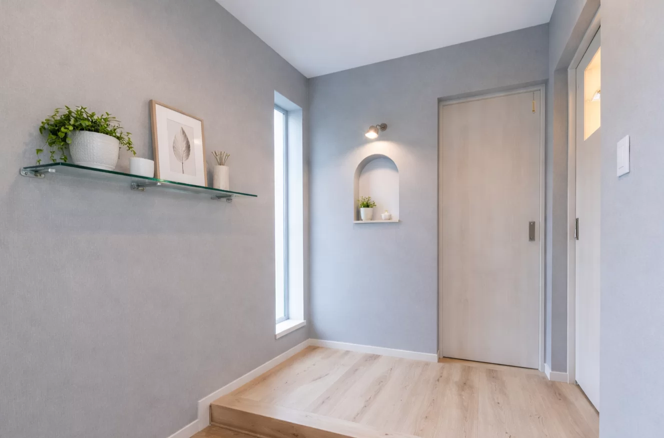 玄関には、壁のくぼみを活かしたニッチやガラス製の棚を設け、ちょっとした小物やお気に入りの雑貨を飾りながら収納できます。細部までデザイン性と機能性を兼ね備えています。