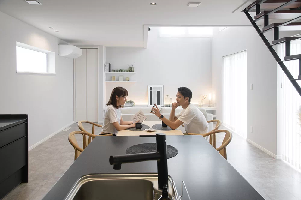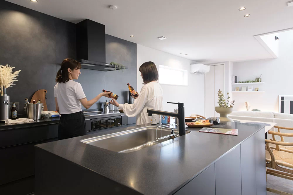 二の字型のキッチンは、配膳しやすく、家族や友人と料理を楽しめる設計。洗練されたデザインも魅力で、来客時のおもてなしもスマートに。