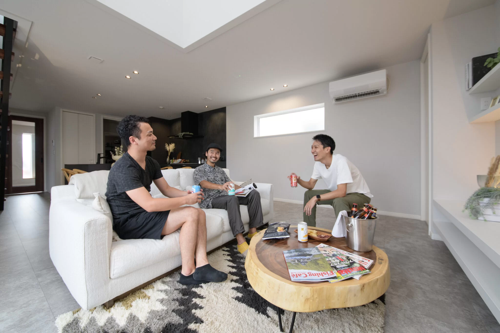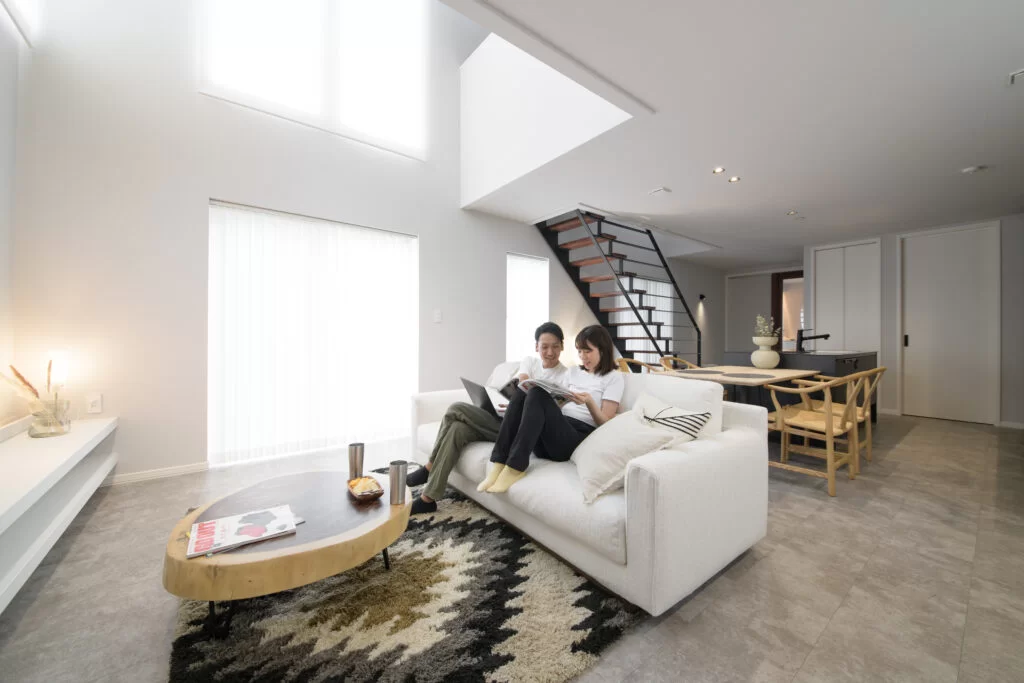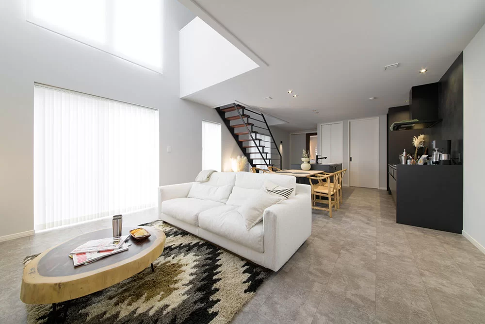 22.5帖の広々としたLDKは、庭を一望できる開放的な空間。鉄骨階段がスタイリッシュに映え、吹き抜けと相まってさらに開放感を高めます。自然と調和する心地よいリビングで、贅沢な時間を。