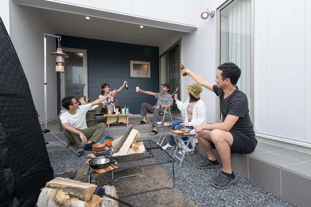 庭にはテントサウナを設置できるスペースを確保。屋根付きのテラスにサウナチェアを置けば、“整いスペース”に。さらに、テラスはLDKだけでなくユーティリティへもつながり、水風呂も可能♪