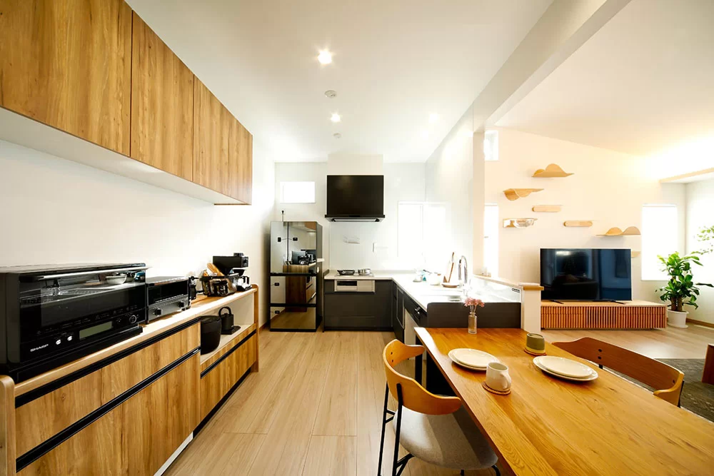 横並びのキッチンダイニングで家事がスムーズに。リビングと一線を画した設計で、リラックスできる空間を演出します。夫婦の新しい生活スタイルにぴったりの動線で、心地よい暮らしをサポートします。