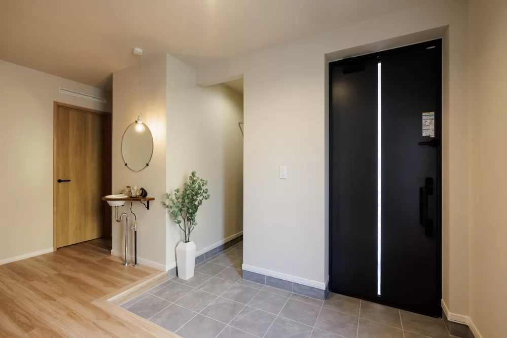 広々とした玄関は、家族全員でもゆとりをもって出入りでき、来客時も安心のスペースです。帰宅後すぐに使える玄関手洗いも完備しており、清潔な暮らしをサポート。大容量のシューズクロークは、靴や季節のアイテムもすっきり片付きます。