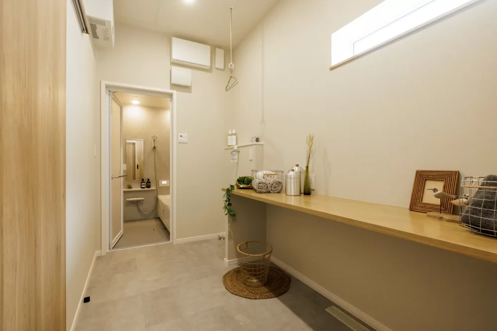 清潔感あふれるユーティリティは、洗面所と脱衣所が分かれているため、家族が同時に使いやすくスムーズに動けます。収納スペースも充実しており、洗剤やタオルなどをすっきり片付けられます。