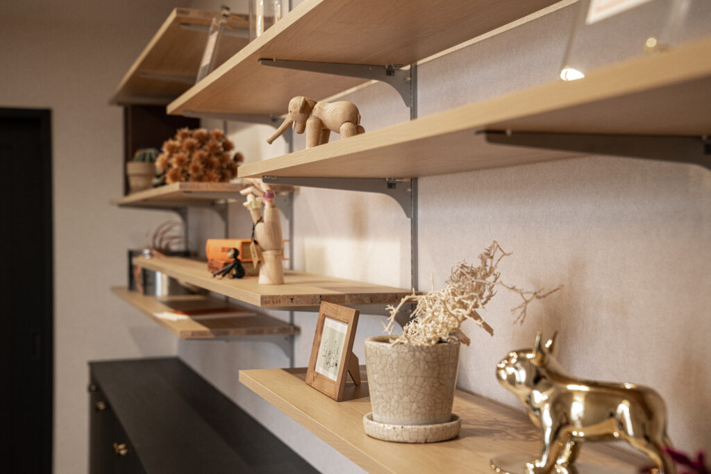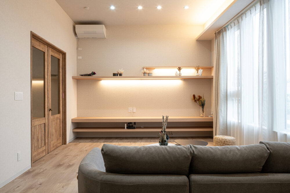 3.3mの高天井で開放感あふれるリビング。壁面収納には間接照明を仕込み、アートや雑貨をスタイリッシュに演出。木目の質感とシンプルデザインが映える、大人のための上質な空間です。