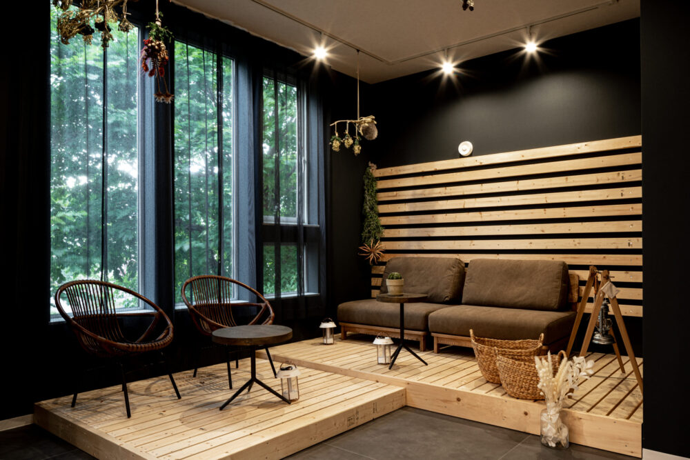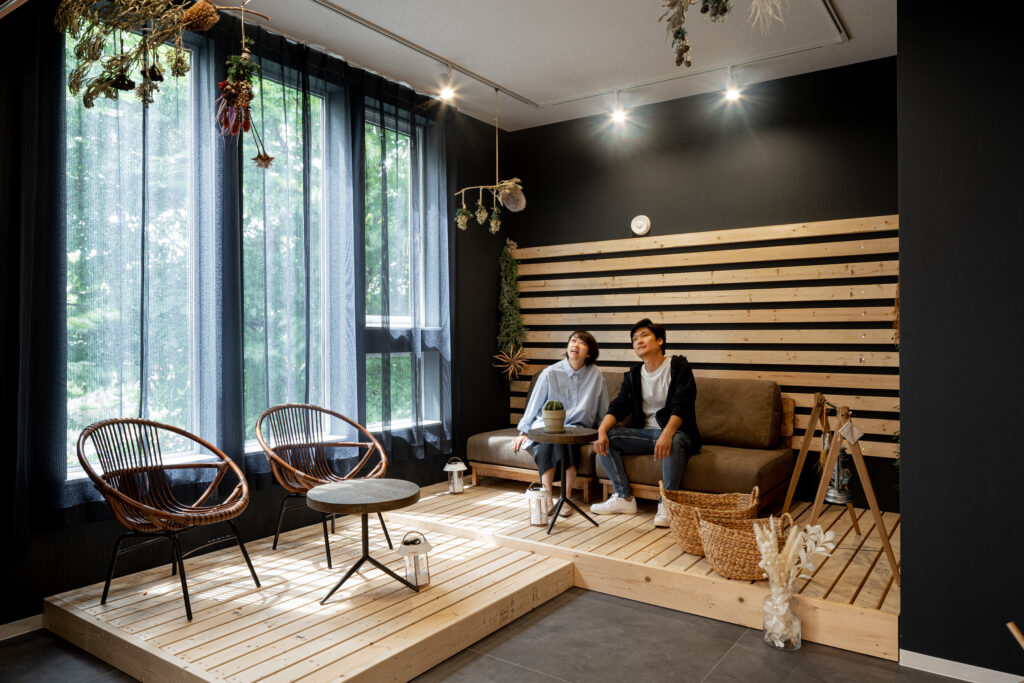 非日常を楽しむ秘密基地のようなインナーテラス。床と背面のウッドパネルが温かみを演出し、伸びやかで心地よい雰囲気。コーヒータイムや読書など、特別なひとときを過ごせます。