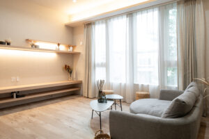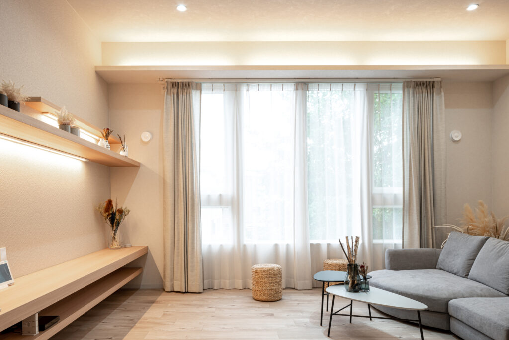 高さ2.2mの大きな窓がリビングにたっぷり光を取り込み、外とつながる開放感を演出。窓上の間接照明がやさしく光を添え、室内に上質な時間をもたらします。