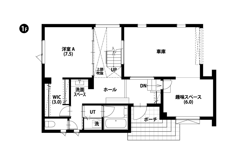 車一台分のインナーガレージ。両サイドのドアを余裕をもって開閉できるほどの広さ、かつ6帖の趣味スペースが隣接しているため、車やバイク、アウトドアが趣味の方には最適。