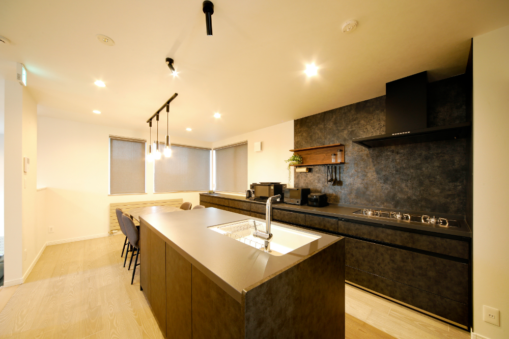 こだわりのⅡ型キッチンはブラック基調のモダンなおしゃれな雰囲気で、お料理が楽しくなります。キッチンを取り囲めるため、立食パーティもできる動線。キッチン横のダイニングテーブルはホームパーティ時など、お料理も運びやすい配置に。