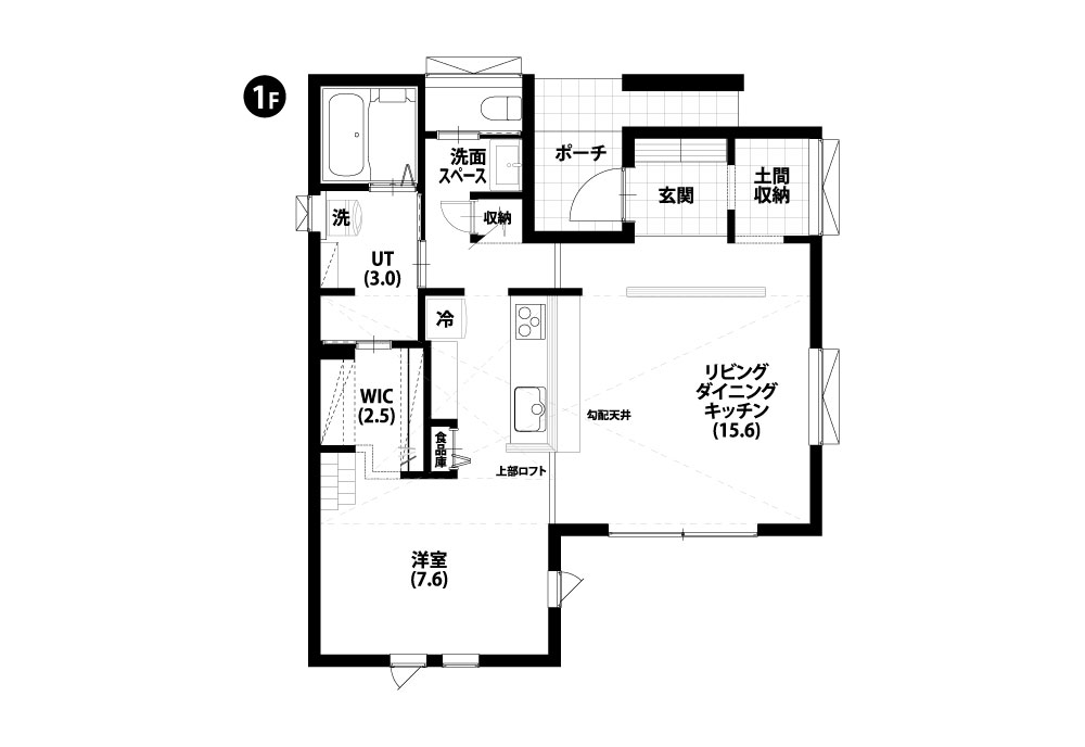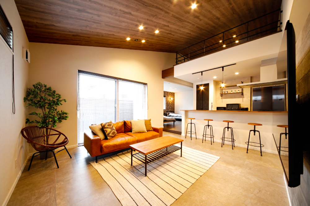 リビング、キッチン、寝室をあえて仕切りをなくし、無駄のない空間に。扉での仕切りがない分、床の素材を変えステップを設けることで、つながっていながら空間ごとに違いを演出。仕切りのないことで愛犬が走り回ることができるのも嬉しい動線。