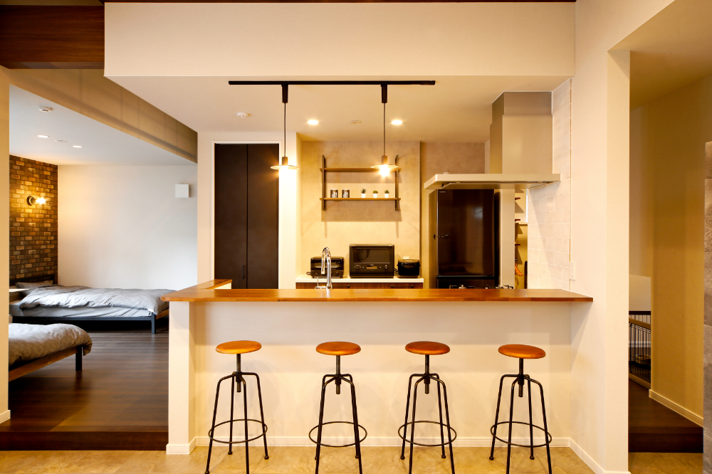 料理をしながらキッチンカウンターでパートナーとの会話をしたり、晩酌をしたりできる夫婦2人の至福の空間。日常の忙しさを忘れ、二人だけの特別なひとときを楽しむための理想の場所です。