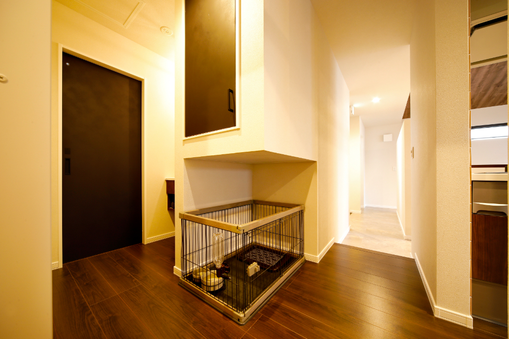 水回りの近くにゲージを配置することで、お手入れが簡単に! ゲージ上部のスペースを活用すれば、ペットグッズの収納もスマートに行えます。愛犬と快適に過ごせる、実用的で工夫が光るスペースです。