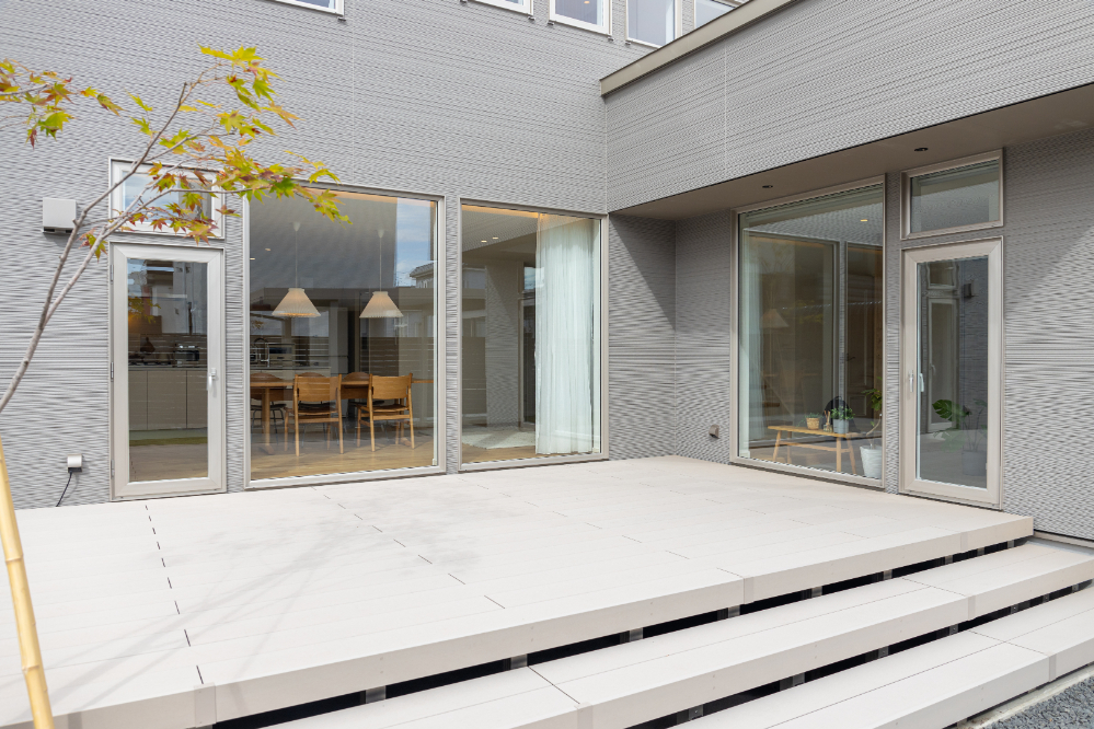 リビングとほぼ同じ高さに設計されたウッドデッキは、四季を通して家族の遊び場に。BBQや雪遊びなど、家の中にいながら自然を感じられる特別な空間です。