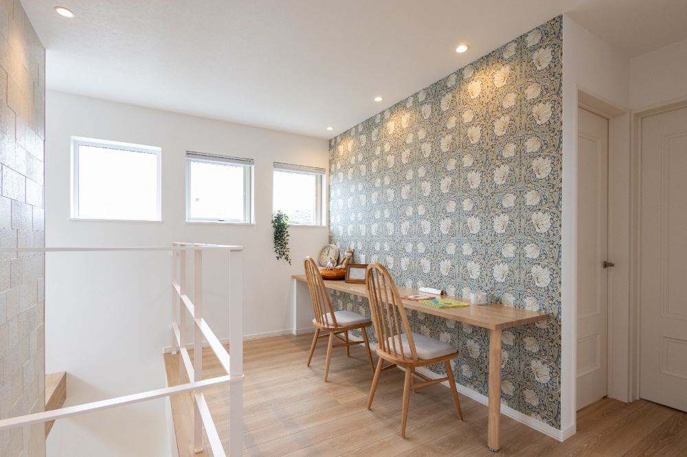 カウンタースペースは、子どもの学習に最適。吹き抜け設計で、家族がどこにいても気配を感じられ、安心して学べる環境です。