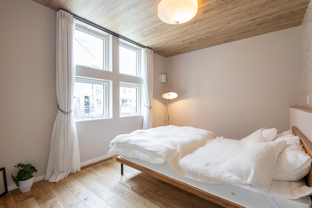 リビングと廊下・階段で区切られた1階の寝室は、音の干渉を抑え、静かで快適な睡眠を確保。子育ての合間に安らげる場所です。