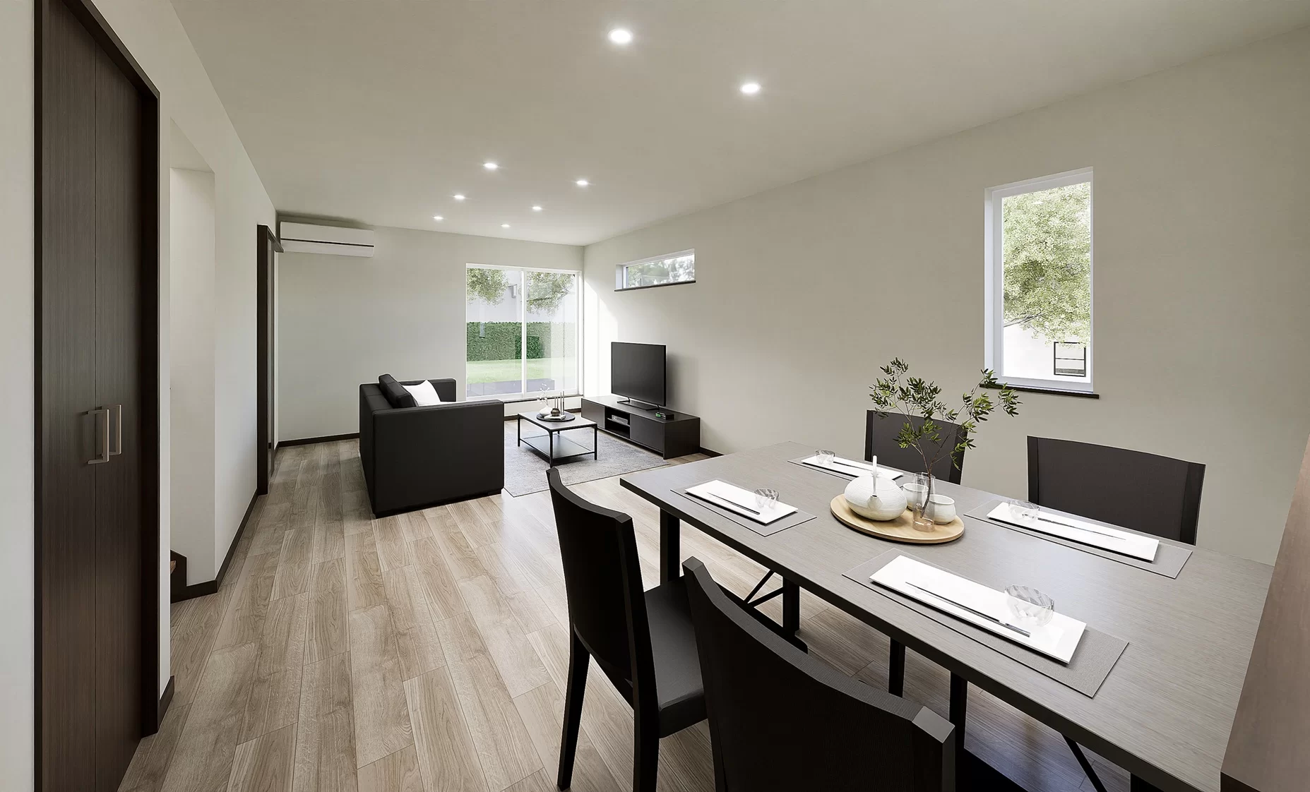 18.7帖の広々としたLDK。ダイニングテーブルを置いてもリビングスペースがゆったり確保され、家族みんながのびのび過ごせます。大きな窓から光が差し込み、開放感あふれる空間です。
