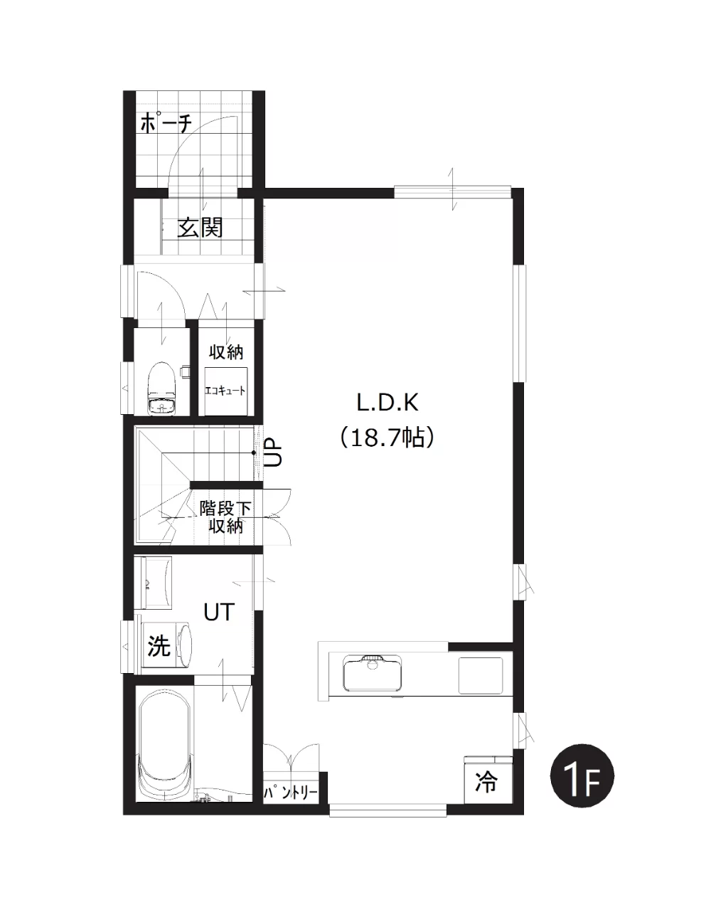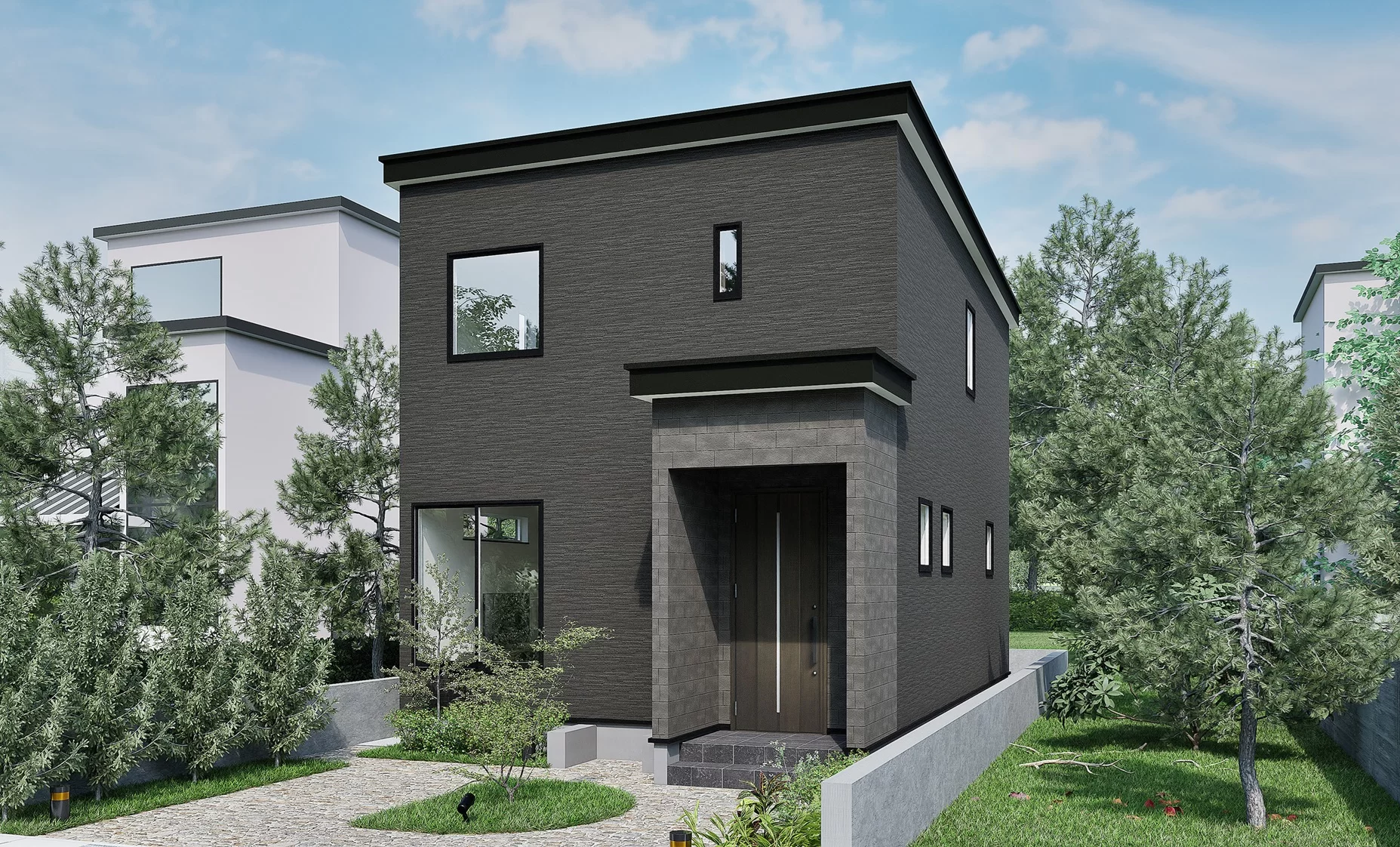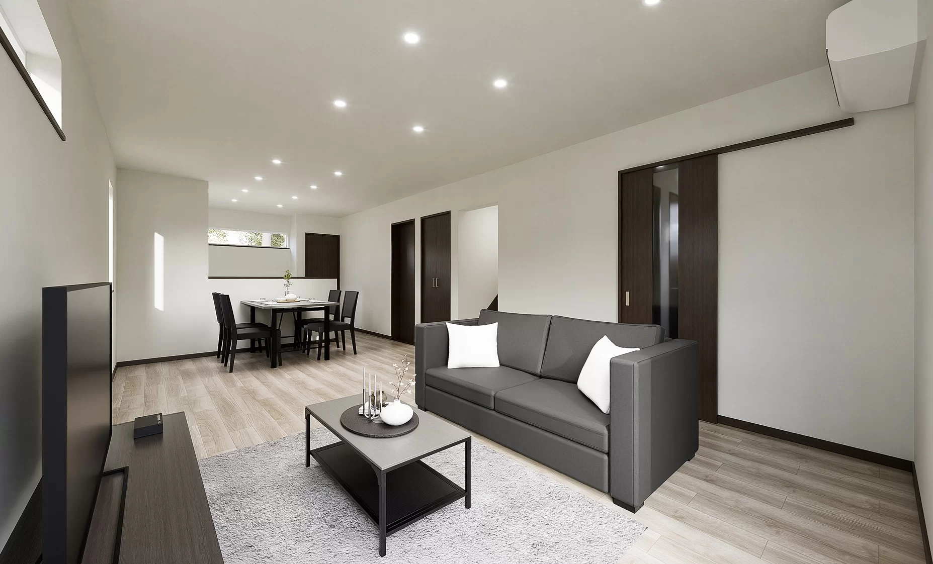 ホワイト×ブラックで統一された、洗練されたシンプルモダンスタイル。扉付きの階段下収納やパントリーも備え、デザイン性と収納力を兼ね備えた住まいです。