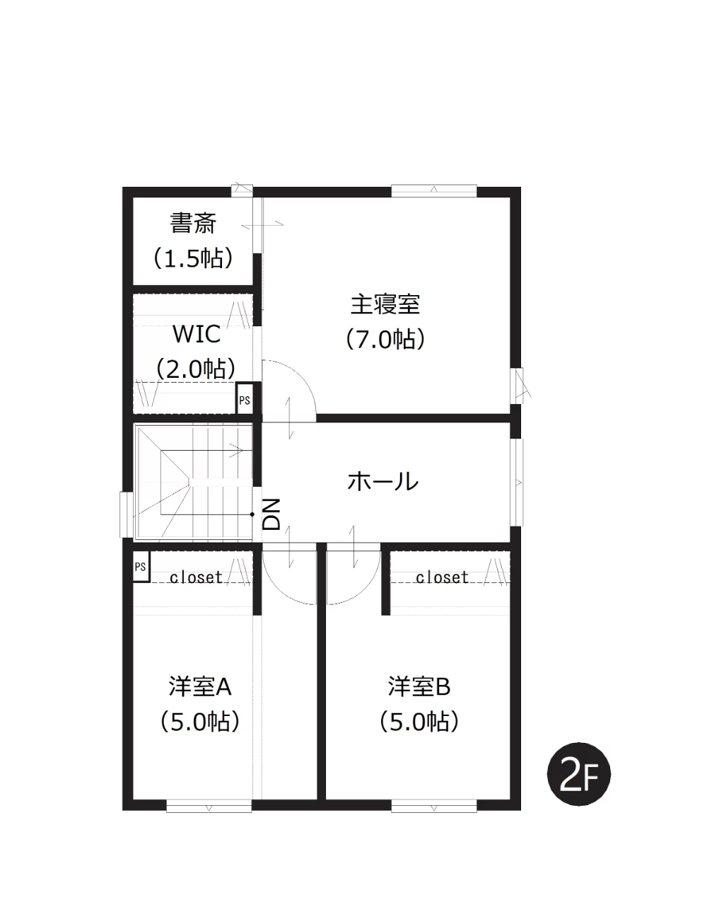 主寝室には2帖のウォークインクローゼットを設けました。衣類はもちろん、季節のアイテムもすっきり収納。整理整頓しやすく、いつでもすっきりとした部屋をキープできます。