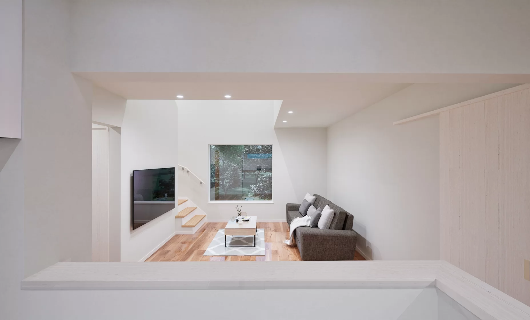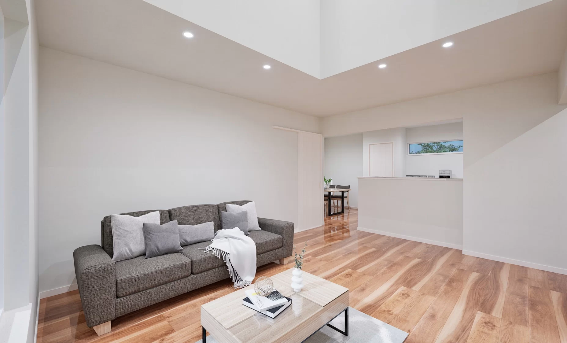 吹抜けから光が差し込む明るいリビング。あえてリビングとダイニングを分けることで、食事の場とくつろぎの場を明確に。それぞれの時間を大切に過ごせるから、家族の団らんも一層心地よく過ごせます。