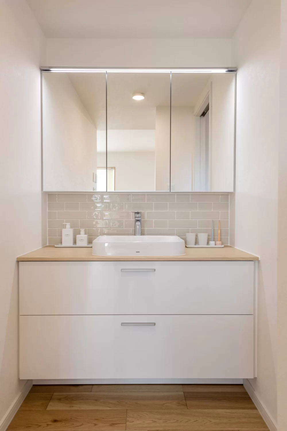 洗面台は使い勝手の良いフルスライドタイプでたっぷり収納でき、いつでもスッキリ整った空間に。また、脱衣室と分けているので、家族が入浴中でも気軽に利用でき、来客時にも便利です。