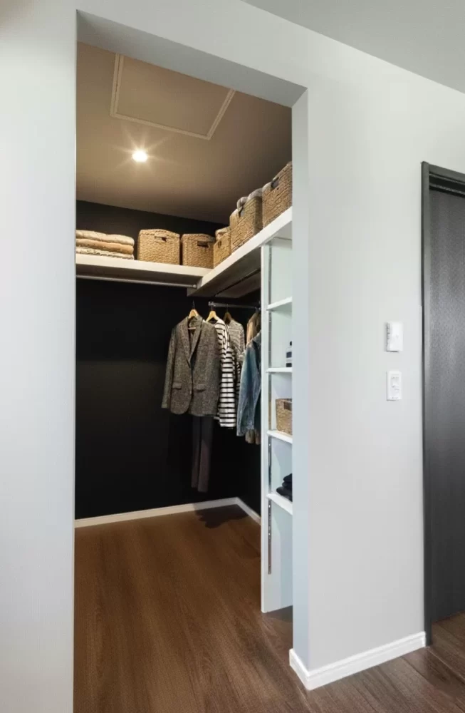 玄関からつながるシューズクロークには、ハンガーパイプと可動棚を設置。コートや傘はもちろん、外出時に使う小物類もまとめて収納でき、玄関をいつでもすっきりと保てます。