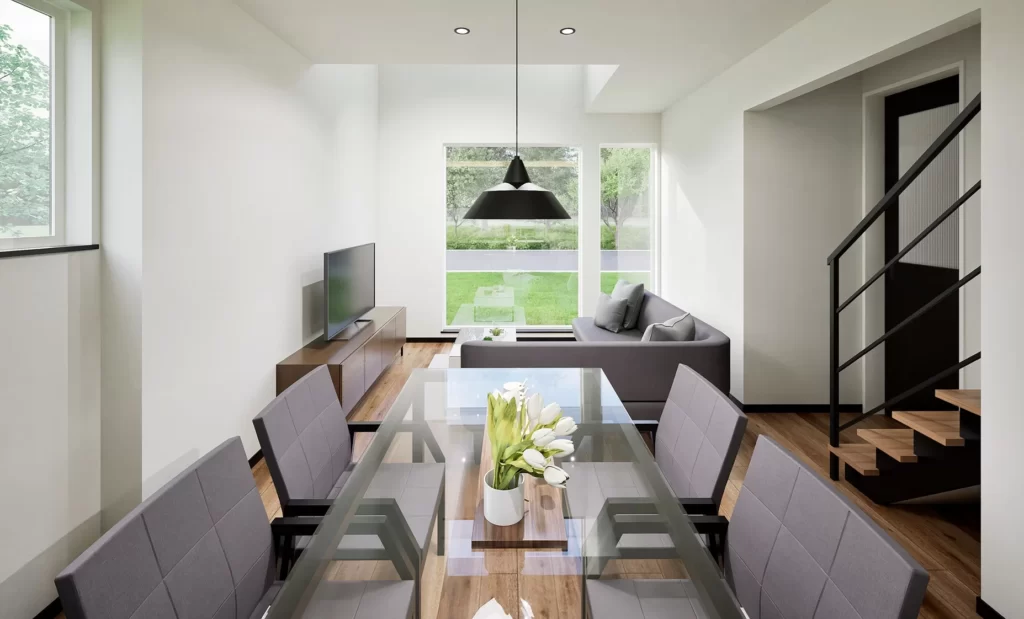 吹き抜けから明るい陽光が差し込む、心地よいリビングダイニング。アイアン手すりの階段が空間のアクセントとなり、ヴィンテージモダンで上質な雰囲気を際立たせます。