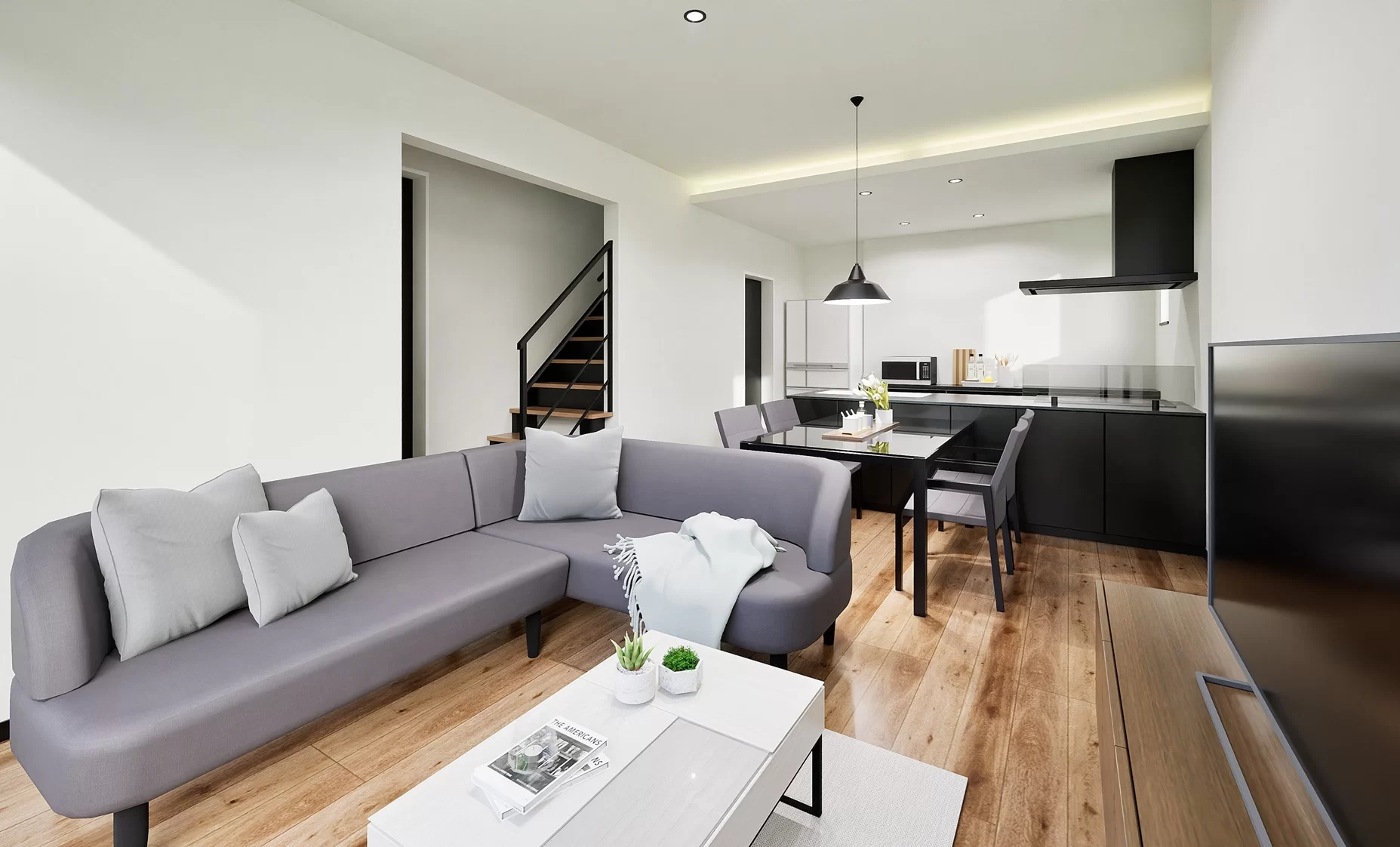 キッチンからリビング全体を見渡せる、開放感のあるLDK。ペニンシュラキッチンがリビング・ダイニングと自然につながり、料理をしながら家族との会話が弾む、心地よい住まいです。