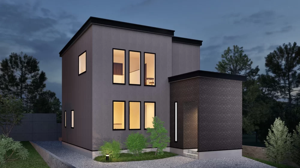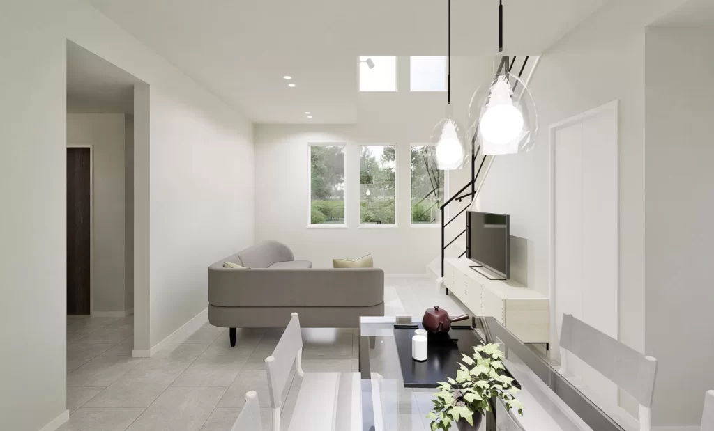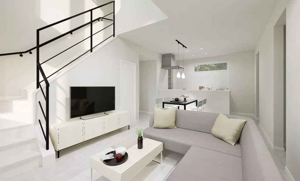 モダンカラーで統一された内装に、アイアン手すりの階段がアクセントのLDK。吹き抜けで開放感があり、キッチンは冷蔵庫を隠す設計で生活感を感じさせず、すっきりとした空間に仕上げました。