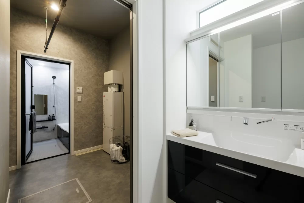 ゆったりサイズの洗面台は脱衣室と分けて配置。家族が入浴中でも気兼ねなく使え、来客時にも便利です。時間帯が重なっても使いやすく、毎日の身支度をスムーズにこなせます。