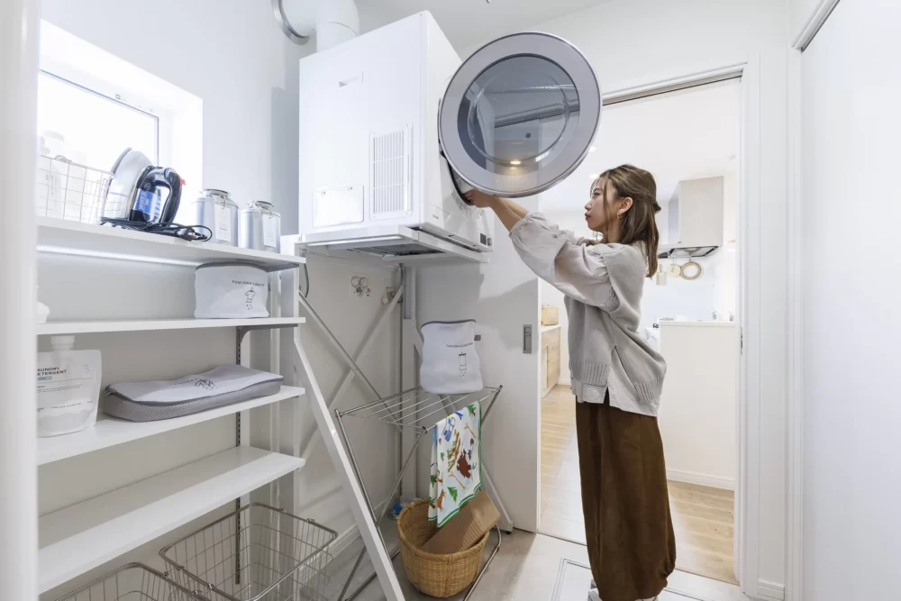 洗面と独立したユーティリティは、来客時も気兼ねなく利用可能。棚を置いてタオルを収納したり、アイロンをかけたりできるため、家事を効率よくこなせます。