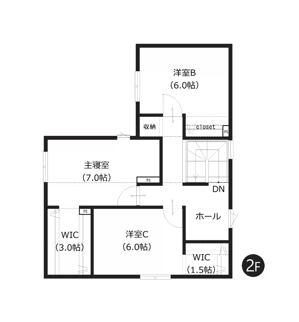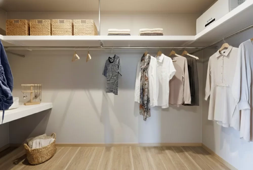 2階には2か所のウォークインクローゼットを設置。枕棚とステンパイプを備え、お洋服や小物をすっきり収納。季節ごとの衣類も整理しやすく、家族全員の荷物をまとめて管理できるため、身支度もスムーズです。