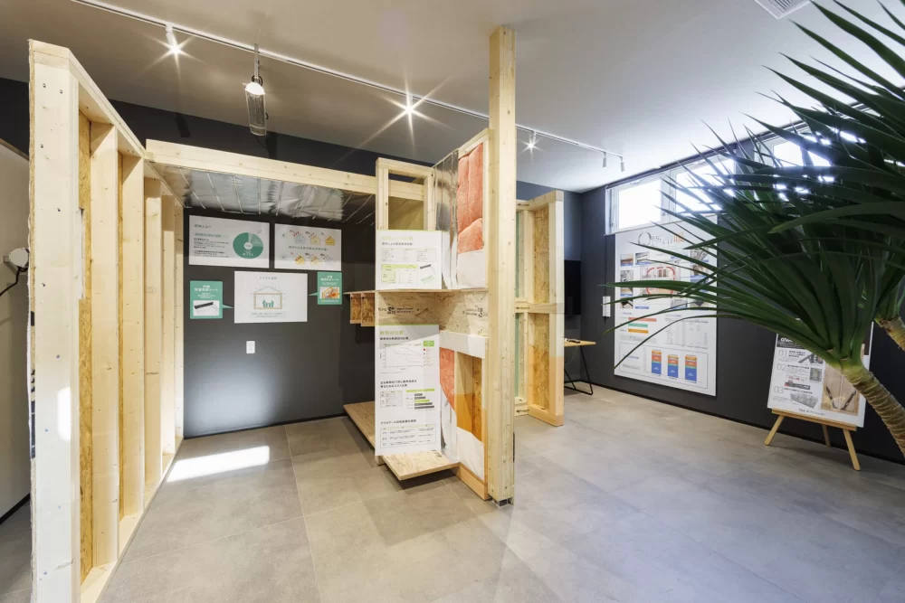 ロゴスホームの快適な住まいの鍵となる「全館空調」。ショールームではその仕組みをわかりやすく解説しています。光熱費を抑えながら、家中どこでも温度差の少ない快適な暮らしをご体感ください。