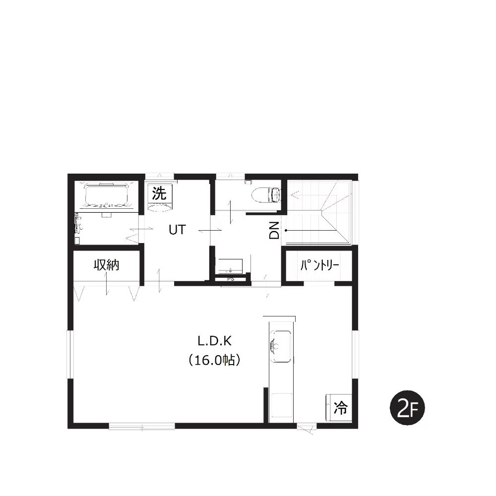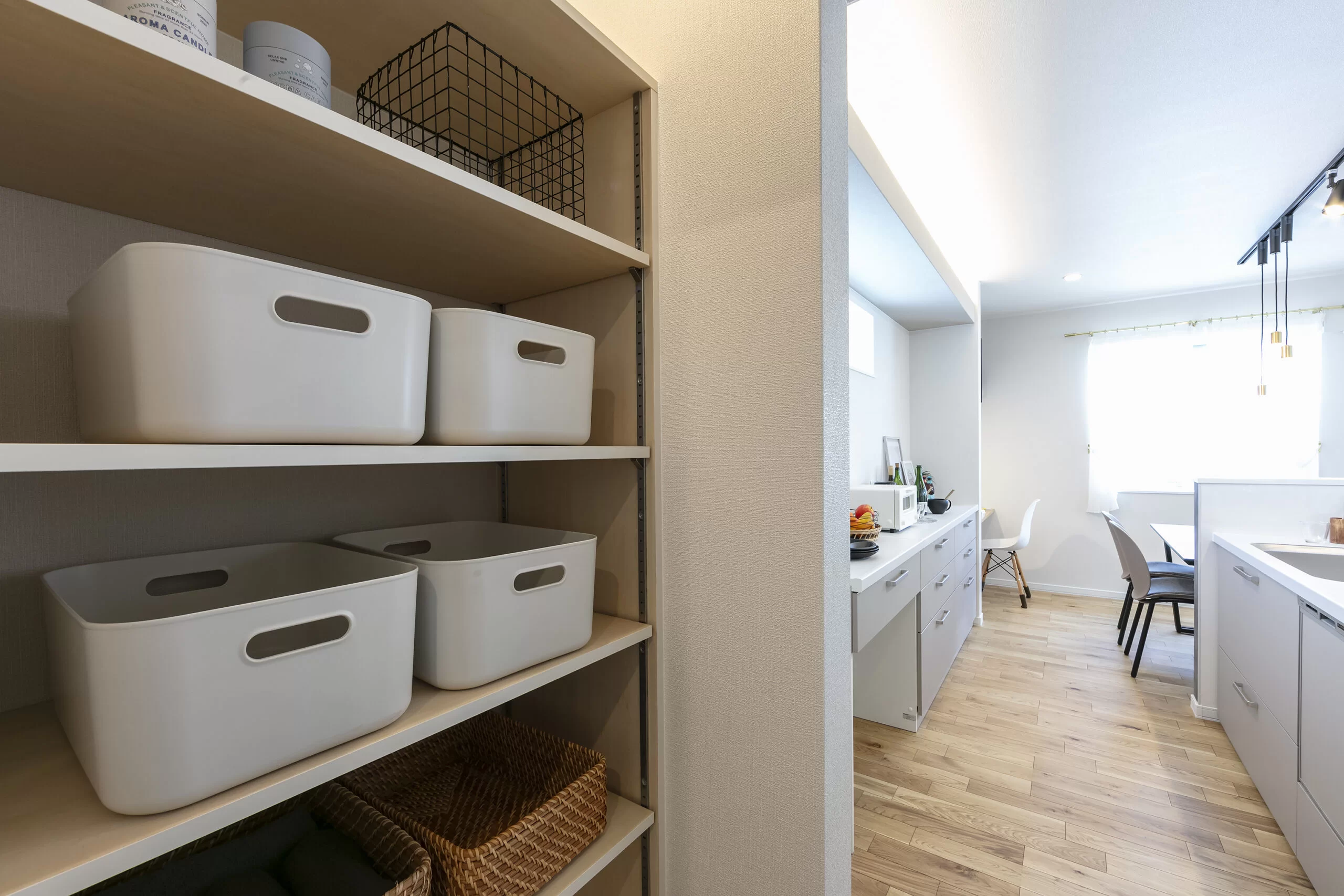 日々の食料品ストックや防災用の飲料水なども収納できるサイズのパントリーをもうけています。生活感の出やすいキッチンまわりをいつもすっきりと保てます。