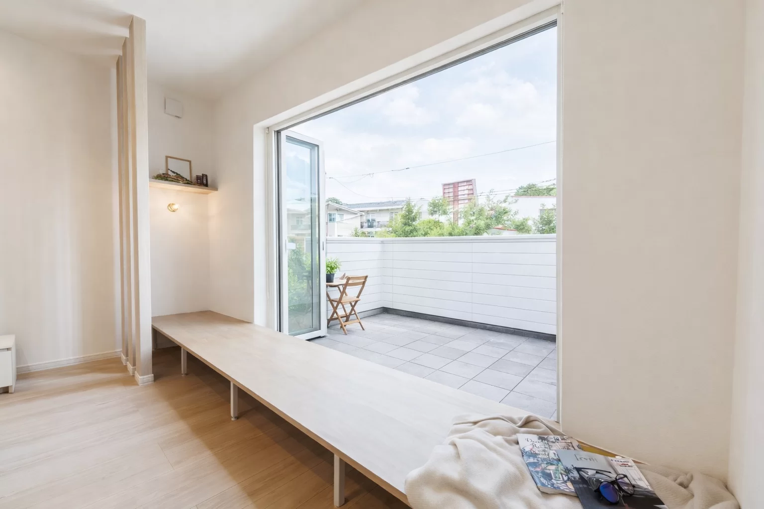 窓を開け放てば、リビングと外がつながる穏やかな空間。バルコニーでのティータイムや、縁側のような腰掛けスペースでの読書など、日常にゆとりと癒やしをもたらします。