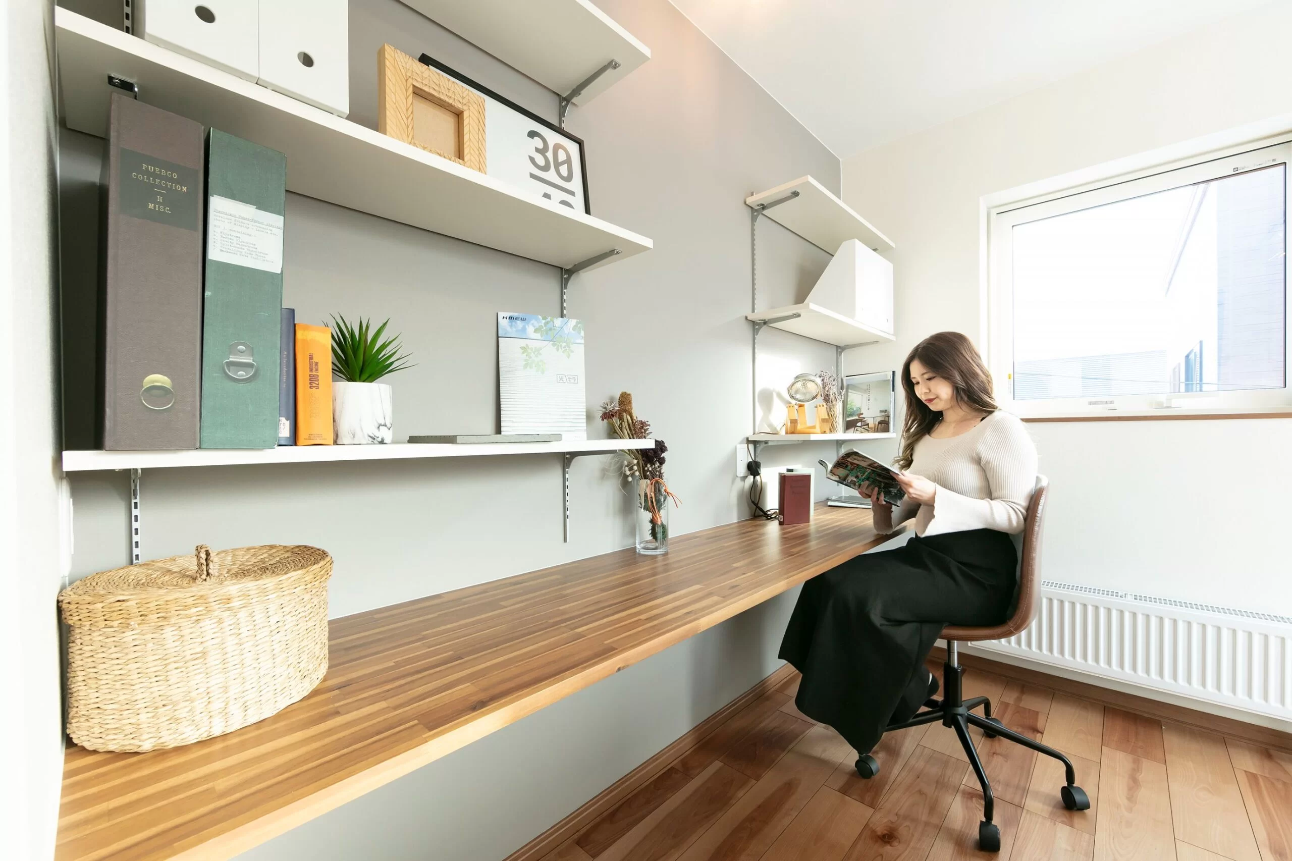 リビングに設けたワイドカウンターは、家事の合間のひと息やお子さまの宿題スペースにぴったり。料理をしながら勉強を見守ったり、会話を楽しんだりでき、家族のコミュニケーションが自然と広がります。