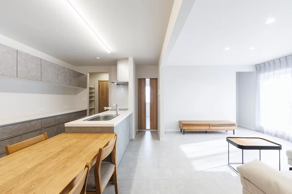 LDKは約21帖で家具を置いても家族でゆったり過ごせる広さ。内装はグレーとナチュラルな木目で落ち着きのある雰囲気に仕上げています。キッチン横には冷蔵庫を収めるパントリーを備えた、生活感を隠せます。