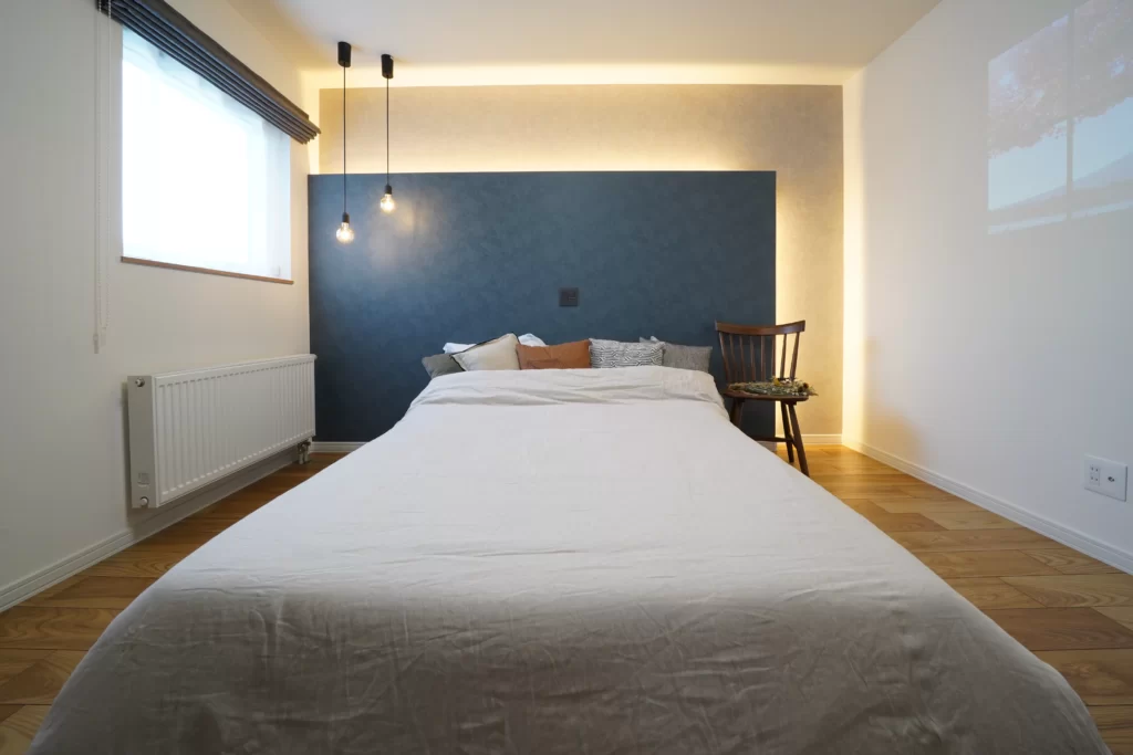 間接照明が灯る主寝室は、やわらかな光に包まれ、非日常のひとときを味わえる贅沢な空間に。さらにキッチンカウンターやホールなどにもデザイン照明を配し、家全体がおしゃれで居心地の良い空間に仕上がっています。