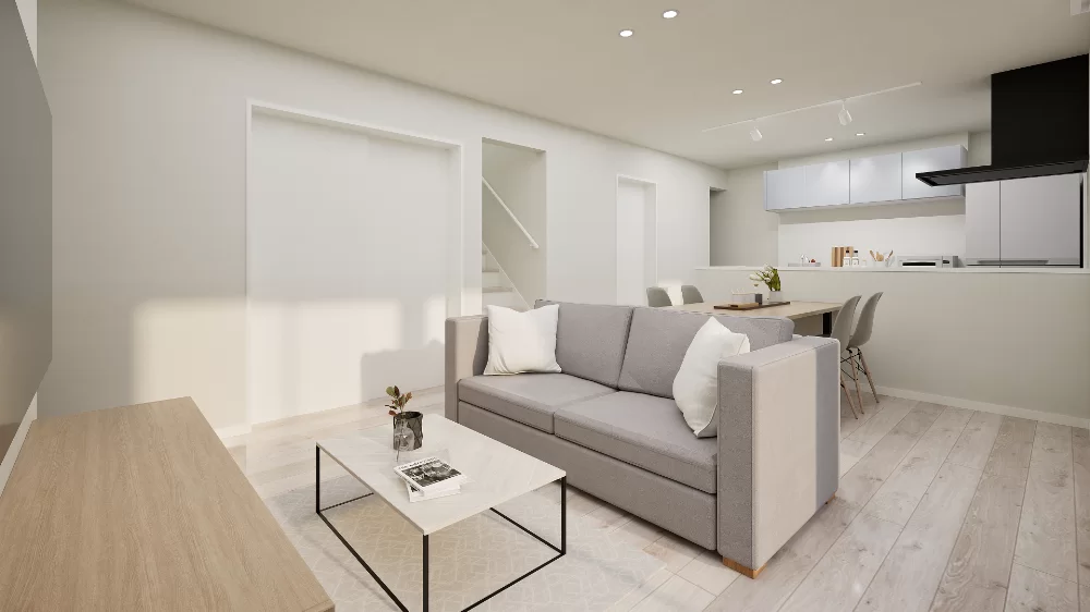 ホワイト×グレーの内装にネイビーの建具をアクセントにしたディープミニマルスタイル。落ち着いた色合いと上質な素材感が、海外モダンの雰囲気を演出する洗練された大人の空間です。