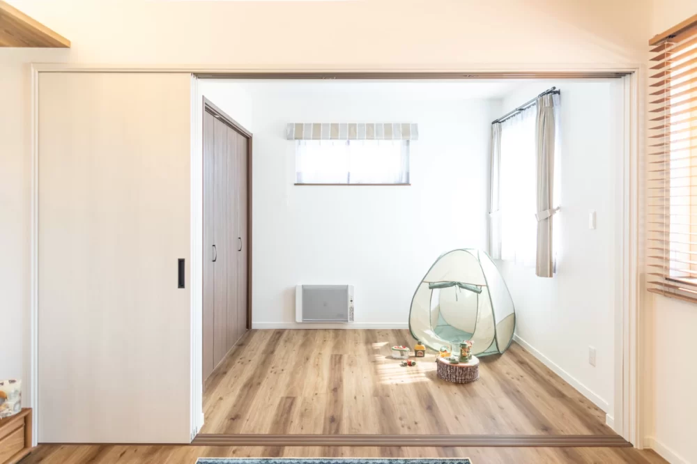 4.5帖の続き間は、暮らしの変化に寄り添う便利な空間。扉を開ければリビングとゆるやかにつながり、子どもの遊び場やお昼寝スペースとしても活躍可能。階段下収納も備え、使い勝手の良い間取りです。