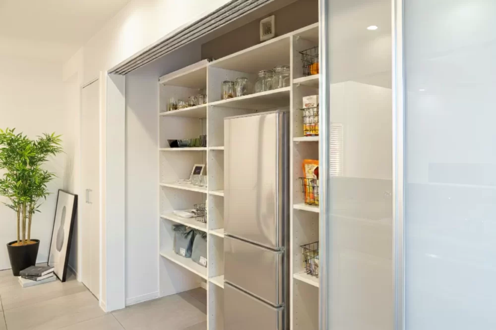 キッチン背面には2.5m超えのカップボードを配置し、家電もすっきり収納可能。さらに、冷凍庫も置けるパントリーも備え、作り置きや食品のストックもたっぷり収納できます。