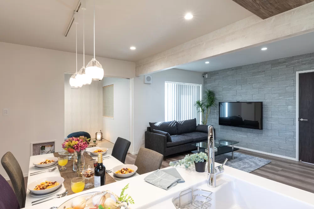 L字型のLDKは、キッチンとリビングをゆるやかにゾーニングしながら、家具を置いても広さと奥行きを感じられる設計。隣接する続き間の扉を開ければ、さらに開放感のある空間が広がります。