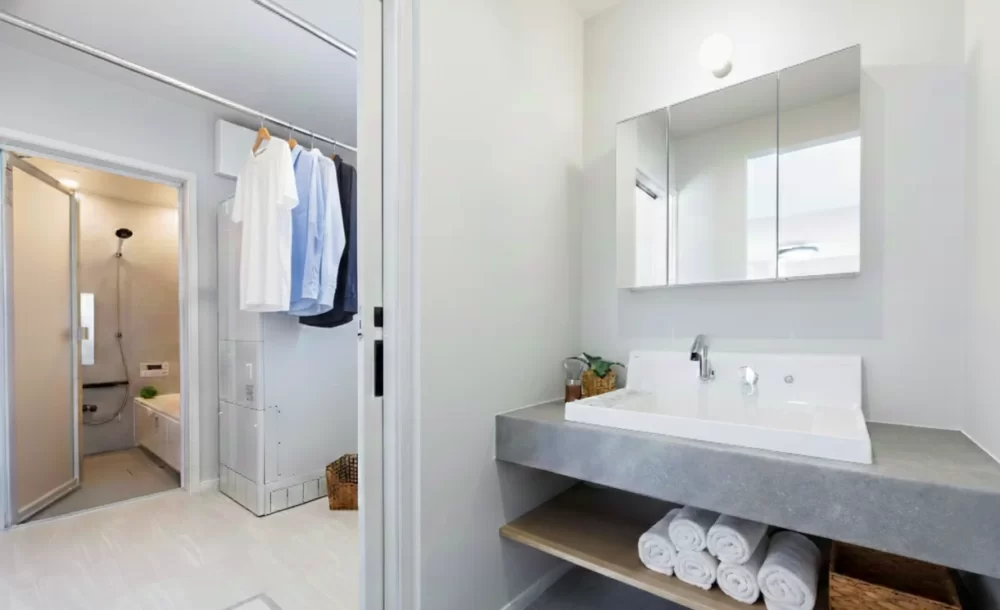 造作風の洗面化粧台は下部がオープンでタオルなども整理でき、おしゃれで使いやすい設計。脱衣所と分けて配置しているため、来客時も気兼ねなく使えます。