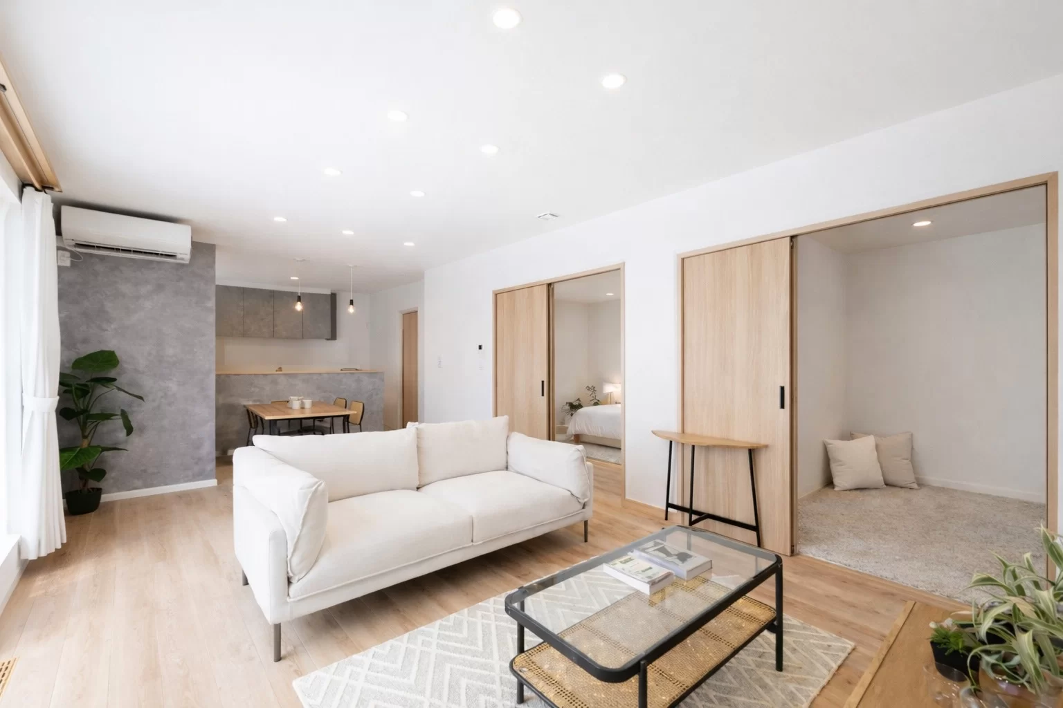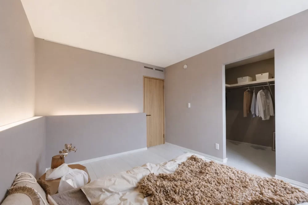 移動がしやすく、毎日の家事や身支度もスムーズに行える平屋。空間を広く使うために、室内のドアには引き戸を採用。暮らしやすさを感じられる設計です。