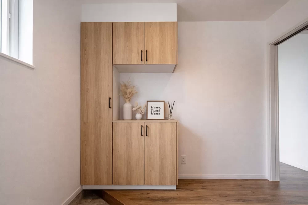 コの字型の玄関収納は、たっぷりしまえる機能性と、お気に入りを飾れる遊び心を両立。雑多な生活感はスッキリ隠して、毎日を「お気に入りの空間」からスタートできます。