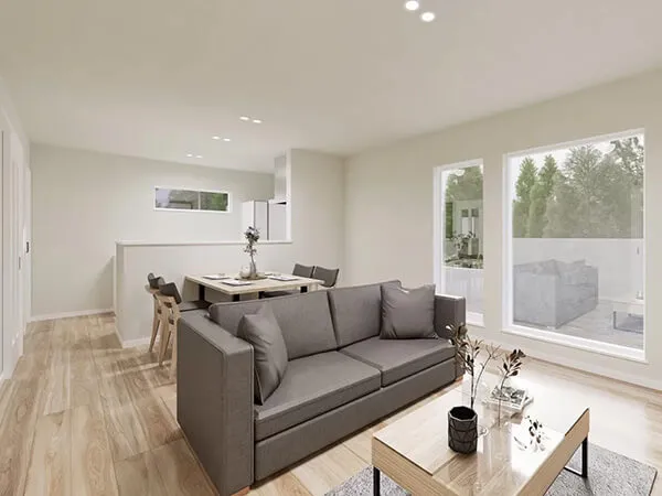 ソフトグレーの建具が印象的な北欧ナチュラルテイストのLDK。やさしく上品な色合いが、リラックスできる心地よい空間を演出します。