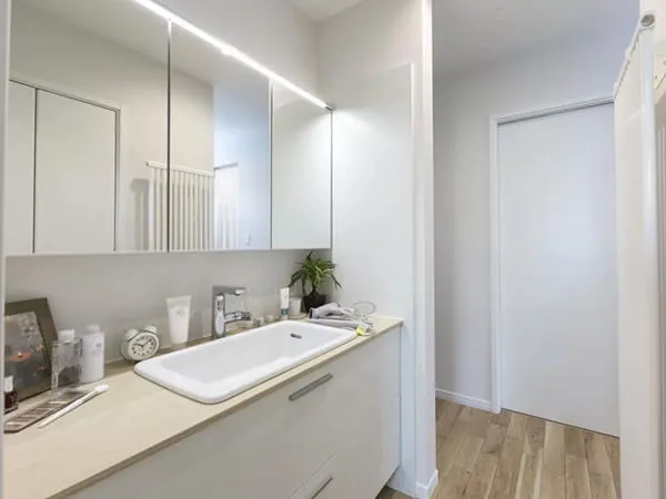 洗面室と脱衣所が分かれており、来客時も気兼ねなく使える安心設計。隣には大容量収納を備え、タオルや洗剤もすっきり収まります。家事や身支度がスムーズに進む快適動線です。