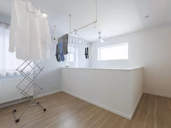 広々とした4帖のユーティリティは、室内干しやアイロンがけなどの家事をまとめて行えます。棚を設けてタオルなどをすっきり収納でき、洗濯から片付けまでの流れがスムーズに進みます。