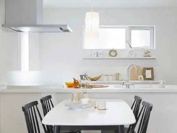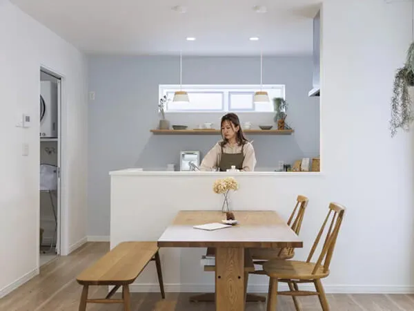 キッチンの背面にはカップボードと窓を配置。やわらかな自然光が差し込み、明るく心地よい空間を演出します。デザイン性と使いやすさを両立し、毎日の料理時間をより楽しく彩ります。
