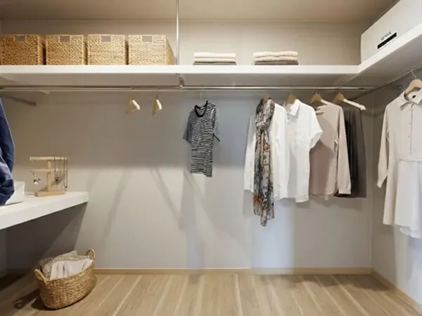 洋室すべてにウォークインクローゼットを設置。枕棚とハンガーパイプを備え、洋服や小物もすっきりと収納できます。部屋の広さもしっかり確保し、家族それぞれがのびのびと過ごせる住まいです。