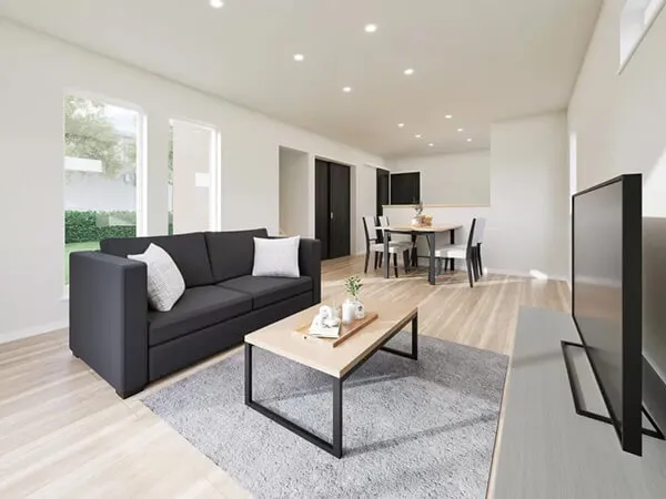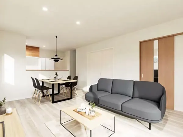 ナチュラルカラーを基調とした、明るく落ち着きのあるLDK。どんなインテリアにも合わせやすく、やさしい色合いが心地よい暮らしを演出します。